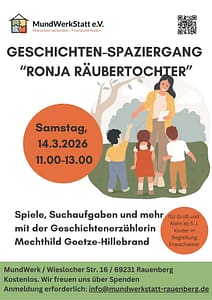MundWerkStatt e.V. und die Geschichtenerzählerin Mechthild Goetze-Hillebrand laden Groß und Klein zu einem „Spaziergang durch Rauenberg“ mit Geschichten, Suchaufgaben und Spielen zu Ronja Räubertochter ein. Alle können mitkommen, die neugierig sind sowie Spaß und Freude mit einem Kinderbuchklassiker erleben wollen.