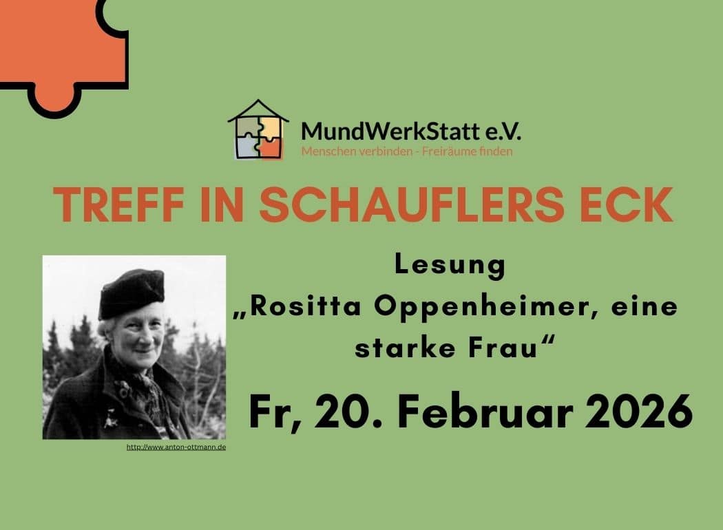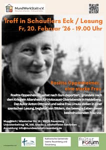 Der Verein MundWerkstatt e. V. lädt am Freitag, 20. Februar 2026, um 19 Uhr zur Lesung „Rositta Oppenheimer, eine starke Frau“ ein. In einer neuen Bearbeitung wird hier die Person der Rositta aus dem Buch „Oppenheimer, Briefe gegen das Vergessen“ von Anton Ottmann in den Mittelpunkt gestellt. 1892 in Walldorf geboren, wurde sie an dem damals sehr fortschrittlichen Fröbelseminar in Kassel zur Erzieherin ausgebildet und arbeitete anschließend im Ausland als Hauslehrerin. 1919 heiratete sie den Ingenieur Leopold Oppenheimer. Mit ihrem Mann und Sohn Hans wurde sie 1940 nach Gurs deportiert und verstand dort, trotz großer Entbehrungen, das Beste aus der Situation zu machen. Sie kam 1946 in die Heimat zurück und gründete in Heidelberg ein Altersheim für jüdische Überlebende des Holocaust. Für ihr Engagement wurde sie mit dem Bundesverdienstkreuz ausgezeichnet.