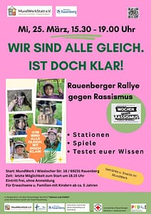 Es gibt eine Rallye durch Rauenberg mit verschiedenen Stationen, an denen kleine Spiele, Basteleien und Aufgaben rund um unser Motto Wir sind doch alle gleich! Ist doch klar! angeboten werden.