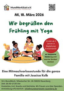 Wir laden euch zu einer Yoga-Mitmachvorlesestunde am Mittwoch, 18. März 2026 ins MundWerk ein. Begleitet Tobi und Mara auf ihren Ausflug zum Frühlingsfest und erlebt mit ihnen das Erwachen der Natur.
